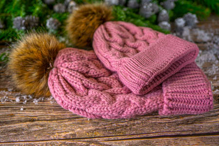Warm knitted pink hats with pompom for mother and daughter. Christmas decoration on wooden background, flat lay.