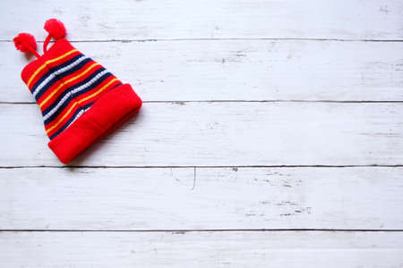 Top view of baby red snow cap on white wooden background with copy space for text.