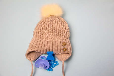 Knitted hat and pacifier on a blue plastic chain with a carabiner in the shape of a bear
