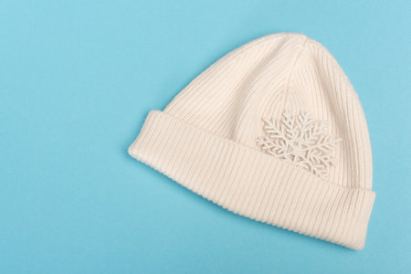 top view of white beanie and snowflake on blue background