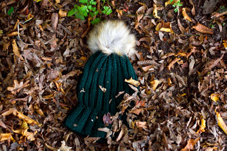 Green woolly hat in autumn leaves
