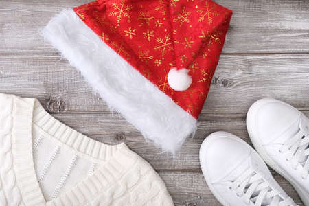 White warm winter knitted sweater, pullover with christmas red santa hat and white sneakers on wooden background winter shopping, sale and discount concept