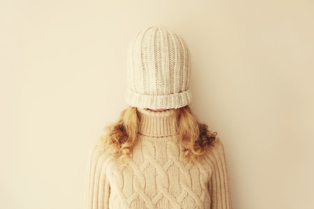 Cheerful funny woman having fun, pulling winter hat over her face covering her eyes in warm soft knitted clothes, sweater on beige studio background