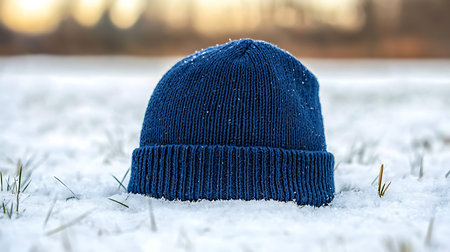 Blue knitted hat on the snow in the park. Winter background.