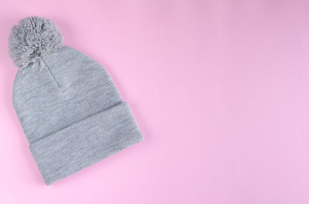 Gray cotton hat composition on pink background. Flat lay, layout and tabletop mockup with copy space.