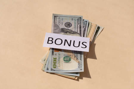 Cash Dollars money and the word BONUS. Concept of bonus