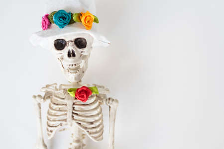 Funny skeleton with hat and colorful flowers on white background with copy space. Halloween and Dia de los muertos concept