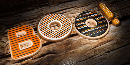 Boo! - Halloween cookies with icing, wooden background - 3D illustration