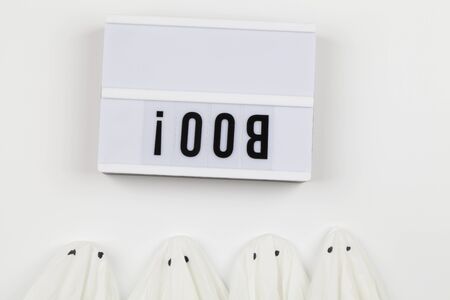 Halloween boo. White ghost holding scary black text in hands on white background, copy space