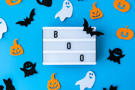 Halloween concept. Lightbox with text BOO and holiday decoration. Flat lay. Top view
