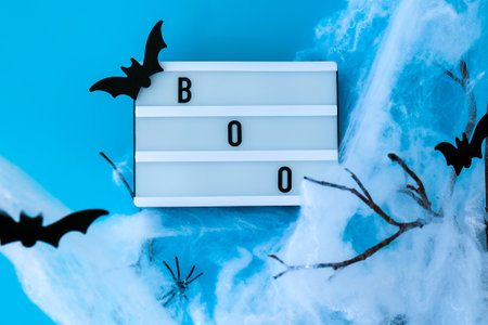 Lightbox with word BOO and halloween party decorations. Bats on dry tree branch with spider net for Halloween on blue background. Top view flatlay