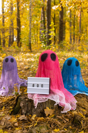 Trick or treat halloween colorful ghosts made of bandages in fall autumnal forest. Halloween greeting card. Handicraft handmade diy