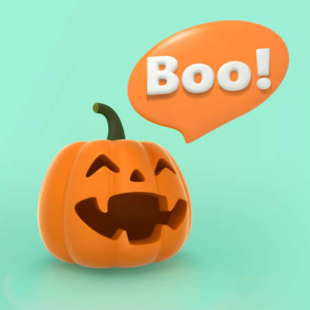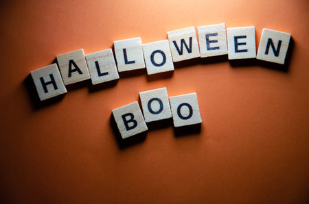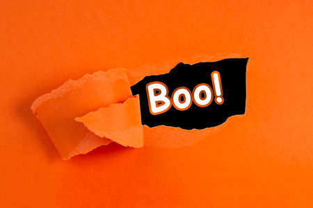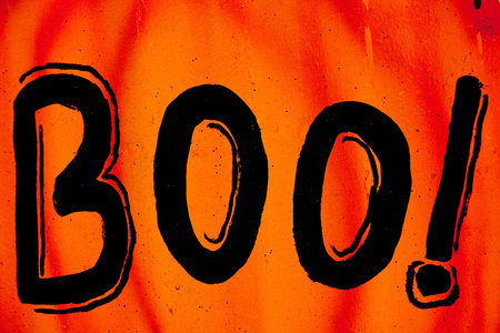 Close up of Boo Halloween text on bright orange background, copy space
