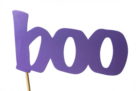 Purple boo short fun saying as photo booth prop for Halloween isolated on white background.