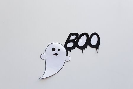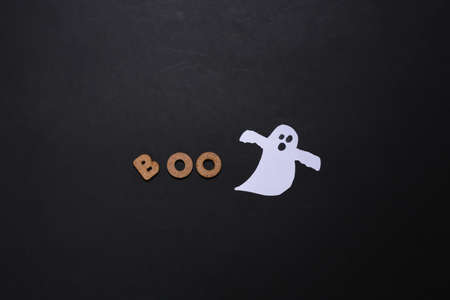 Paper ghost and the word BOO on a black background. Halloween theme