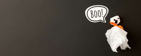 Happy Halloween holiday concept. Simple papercraft ghost from napkin on black background. Halloween party greeting card, invitation, banner. Spelling word Boo Flat lay, top view, overhead