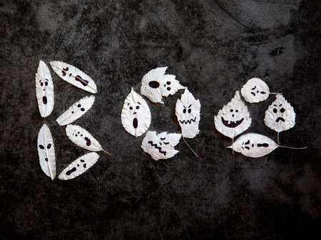 Happy Halloween. The words boo made of spooky autumn leaves. happy halloween, ghost on black background. Holiday party invitation, minimal card, spooky concept. Top view flat lay