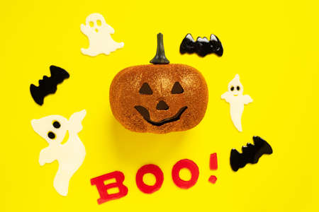halloween flat lay, inscription boo, pumpkin, ghost, black bat on a yellow background, holiday background, postcard. Тraditional festival of autumn
