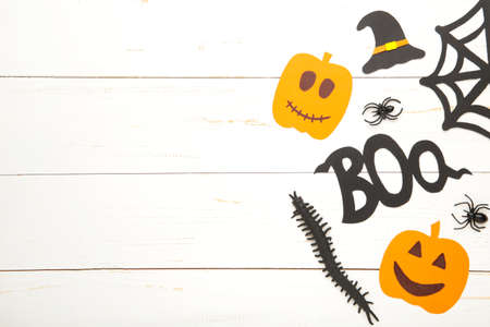 Halloween holiday concept. Halloween decorations, ghosts, bats, Boo on orange background. Halloween party greeting card. Flat lay, top view, overhead.
