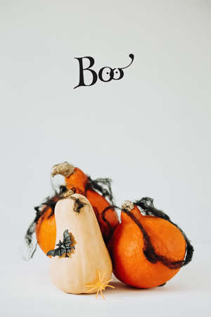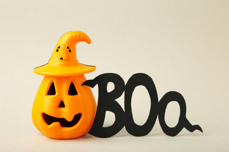 Halloween composition with pumpkin and word BOO on gray background. Top view