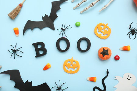 Composition with word BOO, decorations and candies for Halloween on color background