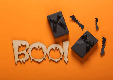 happy halloween celebration. wooden word boo! with gift boxes and bats on orange background. Trick or treat. top view