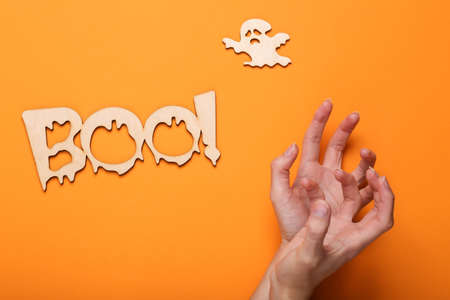 Happy halloween concept. Hand, Wooden ghost and word boo! on orange background. Trick or treat. top view
