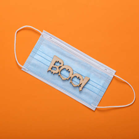 Halloween, covid 19 pandemic. Face mask with the word boo! on orange background