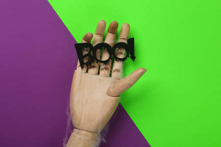 Halloween minimal still life. Wooden hand holding boo! word on purple green background. top view