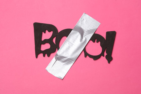 Word boo fixed with adhesive tape on a pink background. Halloween concept. Conceptual pop, contemporary art, minimalist still life