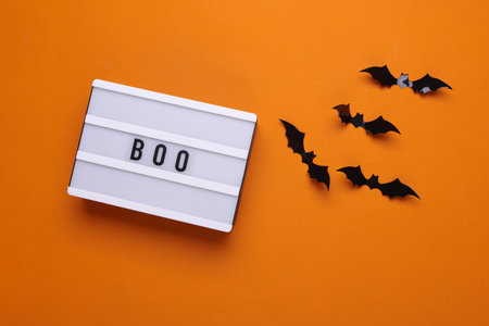 Lightbox with word BOO and halloween party decorations. Bats on dry tree branch with spider net for Halloween on orange background. Top view flatlay