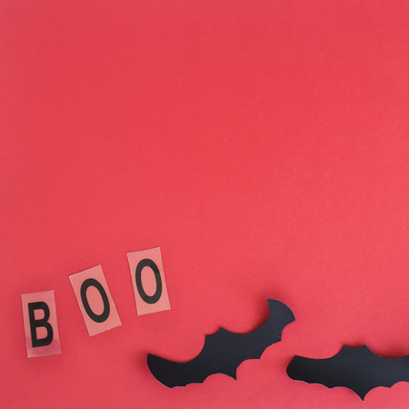 Written Boo and black bats on a red background. Halloween decoration concept.Top view, flat lay, copy space