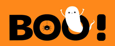 Flying ghost spirit. Boo text with hanging spider insect. Happy Halloween. Cute kawaii cartoon scary spooky character. Smiling face, hands. Greeting card. Flat design. Orange background. Vector