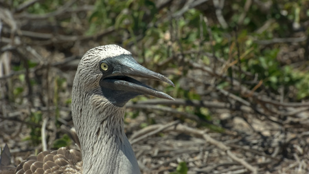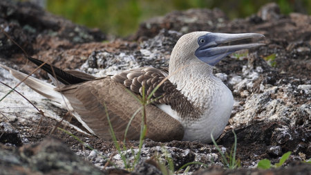 Portrait of blue footed booby nesting in the Galapagos Islands, Ecuador