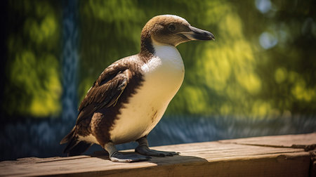 Humboldt penguin standing on a wooden platform in a park
