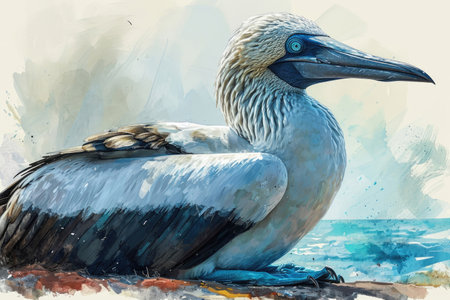 Watercolor image of a Blue-Footed Booby a seabird known for its distinctive blue feet