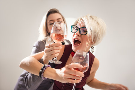 two close girlfriends with glasses of alcohol having fun laughing at a party in the studio on a white background copy paste