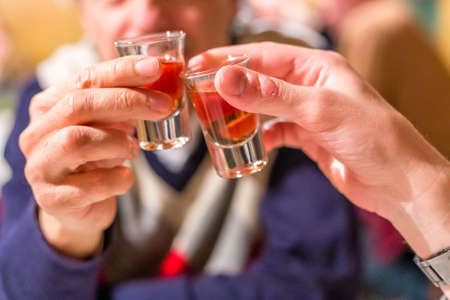 Close up on hands of two unknown men toasting with traditional serbian drink plum brandy rakija slivovitza holding glass called cokance at home