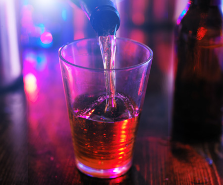 Glass with whisky with ice cube inside on dj controller at nightclub. Dj Console with club drink at music party in nightclub with disco lights. Selective focus