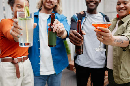 Cropped shot of diverse group of young people enjoying drinks at outdoor rooftop party, copy space