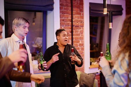 Happy young lgbtq people with bottles of beer dancing in living room in the evening while enjoying home party after dinner