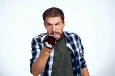 Young guy with a beard on a white isolated background holds a bottle of beer.