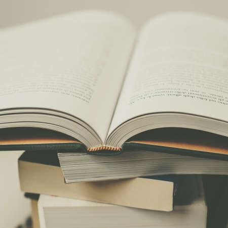 a stack of books with an open book, pages. Reading books, studying, learning, education concept, bookstore, researching