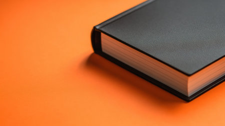 A black leather bound notebook rests on a vibrant orange surface, ideal for creative individuals seeking inspiration and planning tools. The minimal design emphasizes versatility.