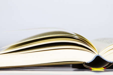 Concept of education, teaching literature, library. Spine end of an open old shabby book, pages fanned out on a background with copy space.