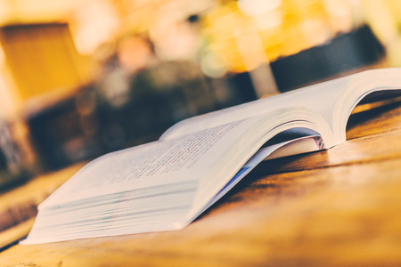 Open book on the table. Side view.