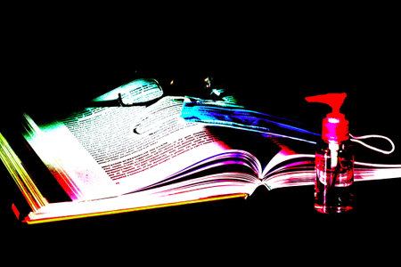 An open book illuminated by a beam of light and smoke on a black isolated studio background. An old textbook with a spot of light on the pages in the darkness of the library. Mysterious open book.