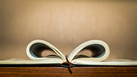 Open book on the table, close-up , bright room. Book in the library. Concept for world book day