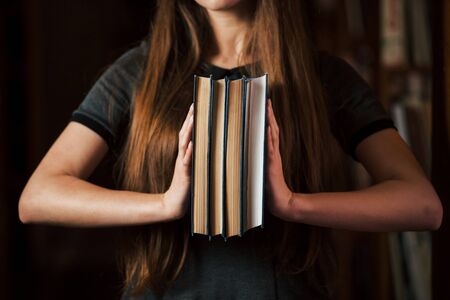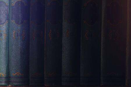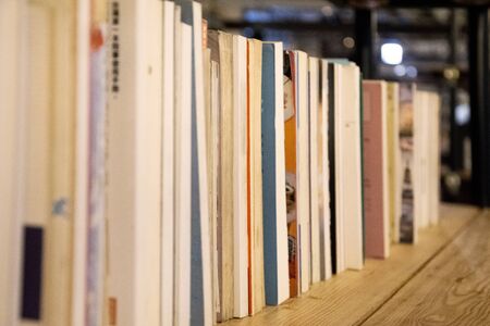 A stack of used books of different thicknesses on the shelf in the library, selective focus