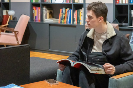 Young person reading book in a cozy bookstore surrounded by blurred figures